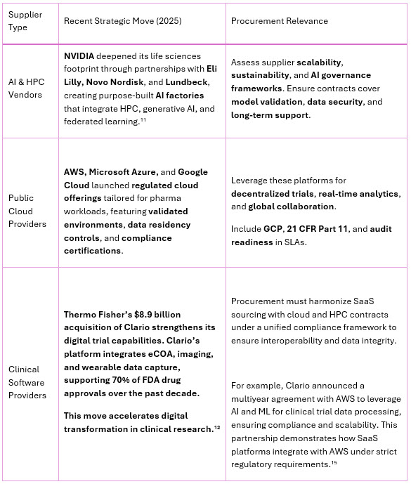 Technology providers are rapidly reshaping portfolios to meet the growing demand for AI-driven drug discovery and digitally enabled clinical trials. For procurement leaders, understanding these shifts is critical to building resilient, compliant, and cost-effective sourcing strategies. Table 2 below summarizes recent strategic moves by key IT suppliers and their relevance for pharma procurement strategies.
