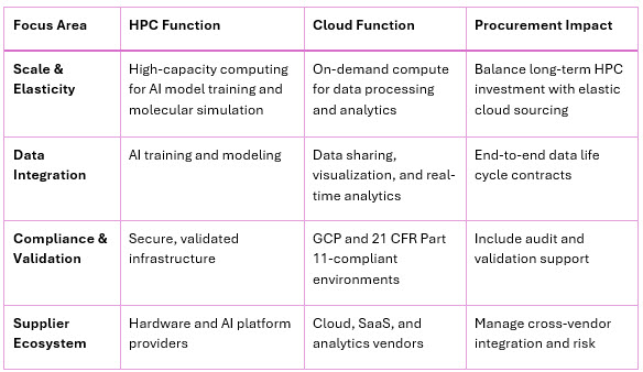 The convergence of AI-driven HPC and elastic cloud infrastructure is redefining sourcing strategies for pharmaceutical organizations. Procurement teams must move beyond traditional IT contracting and adopt frameworks that address hybrid architectures, regulatory compliance, and cost governance. Key imperatives include: