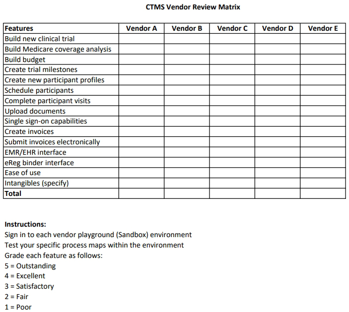 Once clinical trial operation processes are defined and verified, and it’s determined which general applications are to be pursued, the vetting process can begin. A list of all vendors providing the desired applications must be made and prescreened, while simultaneously selecting the vetting team. The vetting team membership may vary depending on the application, but it should always include end users. Organization executives should also be part of the team to ensure an understanding of the objectives and offerings, but the vetting team should not be the final decision-makers.