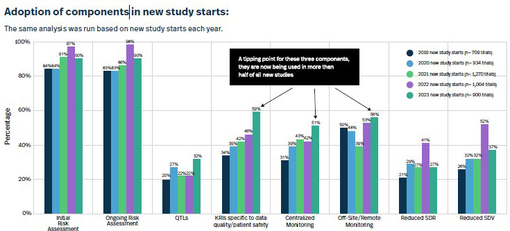 The report leads off with an impressive stat: “In 2023, 88% of clinical trials had at least one RBM or RBQM component included, a massive improvement from 2019, when this figure was only 53%.” It also had some really interesting charts such as the ones I’ve included below about the adoption of RBM-related components both in ongoing and new studies.